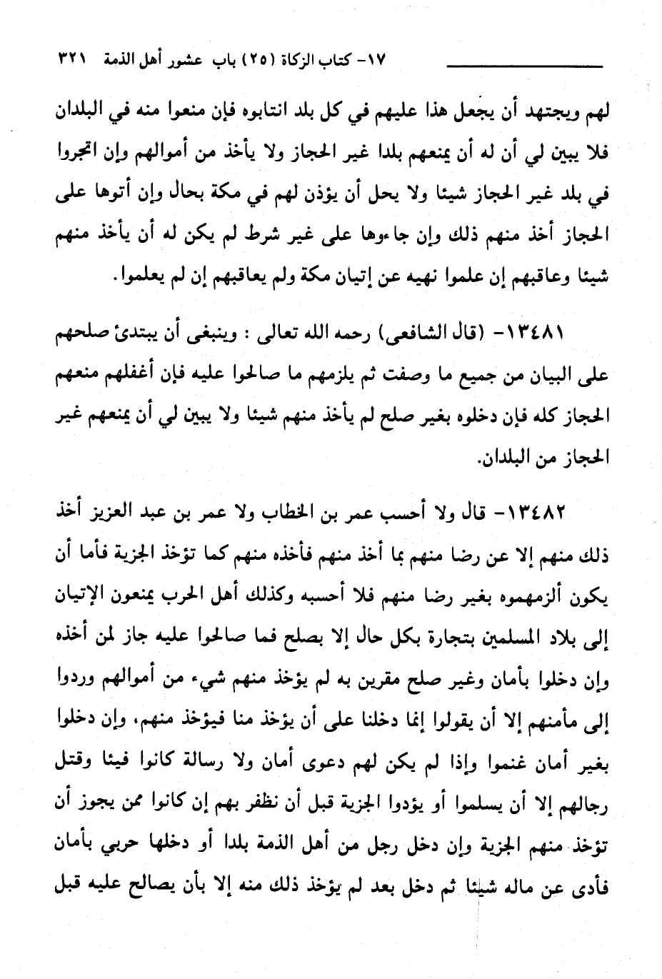 13482 - قَالَ: وَلَا أَحْسَبُ عُمَرَ بْنَ الْخَطَّابِ وَلَا عُمَرَ بْنَ عَبْدِ الْعَزِيزِ أَخَذَ ذَلِكَ مِنْهُمْ إِلَّا عَنْ رِضًا مِنْهُمْ بِمَا أَخَذَ مِنْهُمْ، فَأَخَذَهُ مِنْهُمْ كَمَا تُؤْخَذُ الْجِزْيَةُ، فَأَمَّا أَنْ يَكُونَ أَلْزَمْهُمُوهُ بِغَيْرِ رِضًا مِنْهُمْ فَلَا أَحْسَبُهُ، وَكَذَلِكَ أَهْلُ الْحَرْبِ يُمْنَعُونَ الْإِتْيَانَ إِلَى بِلَادِ الْمُسْلِمِينَ بِتِجَارَةٍ بِكُلِّ حَالٍ إِلَّا بِصُلْحٍ، فَمَا صَالَحُوا عَلَيْهِ جَازَ لِمَنْ أَخَذَهُ، وَإِنْ دَخَلُوا بِأَمَانٍ وَغَيْرِ صُلْحِ مُقِرِّينَ بِهِ لَمْ يُؤْخَذْ مِنْهُمْ شَيْءٌ مِنْ أَمْوَالِهِمْ وَرُدُّوا إِلَى مَأْمَنِهِمْ إِلَّا أَنْ يَقُولُوا إِنَّمَا دَخَلْنَا عَلَى أَنْ يُؤْخَذَ مِنَّا، فَيُؤْخَذُ مِنْهُمْ، وَإِنْ دَخَلُوا بِغَيْرِ أَمَانٍ غُنِمُوا، وَإِذَا لَمْ يَكُنْ لَهُمْ دَعْوَى أَمَانٍ وَلَا رِسَالَةٌ كَانُوا فَيْئًا وَقُتِّلَ رِجَالُهُمْ إِلَّا أَنْ يُسْلِمُوا أَوْ يُؤَدُّوا الْجِزْيَةَ قَبْلَ أَنْ نَظْفَرَ بِهِمْ إِنْ كَانُوا مِمَّنْ يَجُوزُ أَنْ تُؤْخَذَ مِنْهُمُ الْجِزْيَةُ وَإِنْ دَخَلَ رَجُلٌ مِنْ أَهْلِ الذِّمَّةِ بَلَدًا أَوْ دَخَلَهَا حَرْبِيٌّ بِأَمَانٍ فَأَدَّى عَنْ مَالِهِ شَيْئًا ثُمَّ دَخَلَ بَعْدُ لَمْ يُؤْخَذْ ذَلِكَ مِنْهُ إِلَّا بِأَنْ يُصَالِحَ عَلَيْهِ قَبْلَ