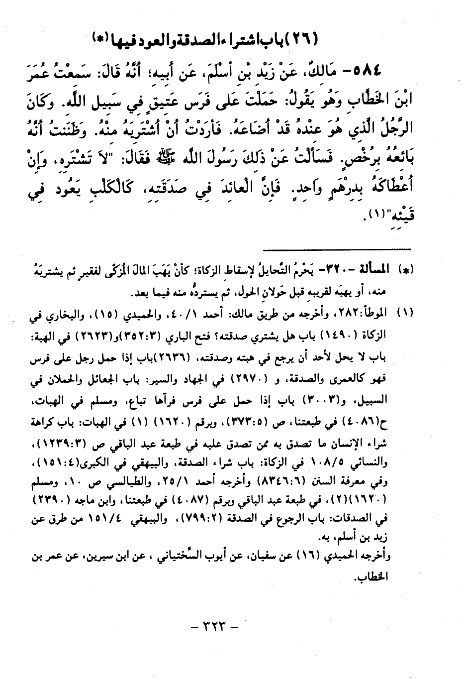 584 - مَالِكٌ، عَنْ زَيْدِ بْنِ أَسْلَمَ، عَنْ أَبِيهِ ; أَنَّهُ قَالَ: سَمِعْتُ عُمَرَ بْنَ الْخَطَّابِ وَهُوَ يَقُولُ: حَمَلْتُ عَلَى فَرَسٍ عَتِيقٍ فِي سَبِيلِ اللَّهِ. وَكَانَ الرَّجُلُ الَّذِي هُوَ عِنْدَهُ قَدْ أَضَاعَهُ. فَأَرَدْتُ أَنْ أَشْتَرِيَهُ مِنْهُ. وَظَنَنْتُ أَنَّهُ بَائِعُهُ بِرُخْصٍ. فَسَأَلْتُ عَنْ ذَلِكَ رَسُولَ اللَّهِ صَلَّى اللَّهُ عَلَيْهِ وَسَلَّمَ فَقَالَ: " لَا تَشْتَرِهِ، وَإِنْ أَعْطَاكَهُ بِدِرْهَمٍ وَاحِدٍ. فَإِنَّ الْعَائِدَ فِي صَدَقَتِهِ، كَالْكَلْبِ يَعُودُ فِي قَيْئِهِ ".