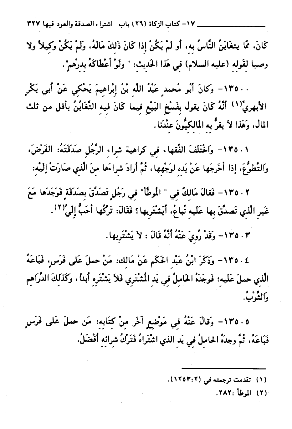 13502 - فَقَالَ مَالِكٌ فِي " الْمُوَطَّأِ " فِي رَجُلٍ تَصَدَّقَ بِصَدَقَةٍ فَوَجَدَهَا مَعَ غَيْرِ الَّذِي تَصَدَّقَ بِهَا عَلَيْهِ تُبَاعُ، أَيَشْتَرِيهَا ؟ فَقَالَ: تَرْكُهَا أَحَبُّ إِلَيَّ.