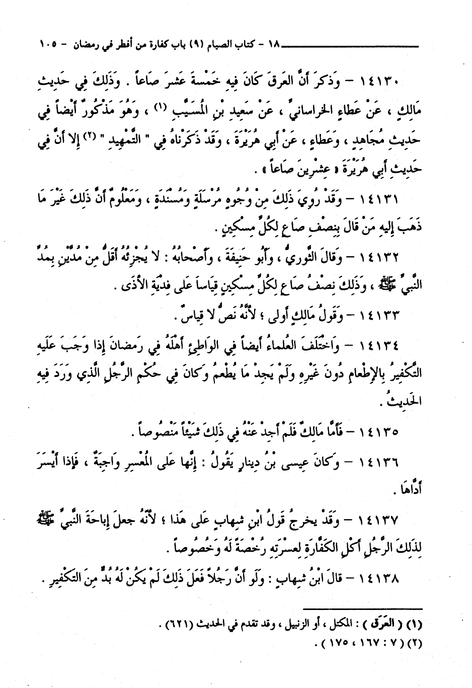14130 - وَذَكَرَ أَنَّ الْعَرَقَ كَانَ فِيهِ خَمْسَةَ عَشَرَ صَاعًا. وَذَلِكَ فِي حَدِيثِ مَالِكٍ، عَنْ عَطَاءٍ الْخُرَاسَانِيِّ، عَنْ سَعِيدِ بْنِ الْمُسَيَّبِ، وَهُوَ مَذْكُورٌ أَيْضًا فِي حَدِيثِ مُجَاهِدٍ، وَعَطَاءٍ، عَنْ أَبِي هُرَيْرَةَ، وَقَدْ ذَكَرْنَاهُ: فِي " التَّمْهِيدِ " إِلَّا أَنَّ فِي حَدِيثِ أَبِي هُرَيْرَةَ " عِشْرِينَ صَاعًا ".