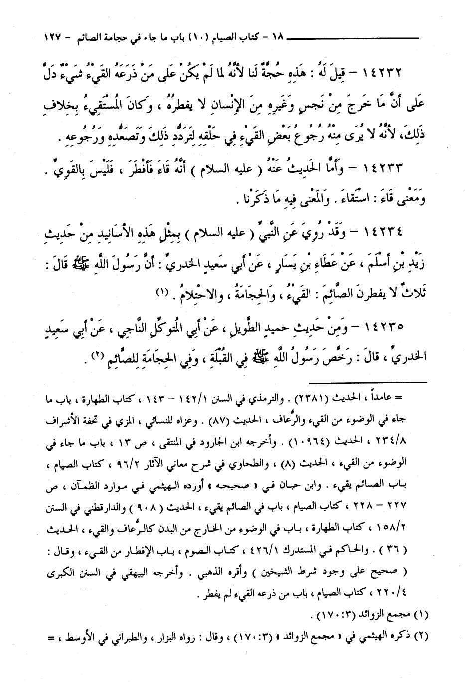 14233 - وَأَمَّا الْحَدِيثُ عَنْهُ - عَلَيْهِ السَّلَامُ - أَنَّهُ قَاءَ فَأَفْطَرَ، فَلَيْسَ بِالْقَوِيِّ. وَمَعْنَى قَاءَ: اسْتَقَاءَ. وَالْمَعْنَى فِيهِ مَا ذَكَرْنَا.