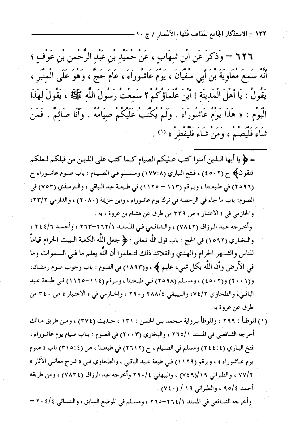 626 - وَذُكِرَ عَنِ ابْنِ شِهَابٍ، " عَنْ حُمَيْدِ بْنِ عَبْدِ الرَّحْمَنِ بْنِ عَوْفٍ ; أَنَّهُ سَمِعَ مُعَاوِيَةَ بْنَ أَبِي سُفْيَانَ يَوْمَ عَاشُورَاءَ عَامَ حَجَّ، وَهُوَ عَلَى الْمِنْبَرِ يَقُولُ: يَا أَهْلَ الْمَدِينَةِ ! أَيْنَ عُلَمَاؤُكُمْ ؟ سَمِعْتُ رَسُولَ اللَّهِ - صَلَّى اللَّهُ عَلَيْهِ وَسَلَّمَ - يَقُولُ لِهَذَا الْيَوْمِ: " هَذَا يَوْمُ عَاشُورَاءَ. وَلَمْ يُكْتَبْ عَلَيْكُمْ صِيَامُهُ، وَأَنَا صَائِمٌ. فَمَنَ شَاءَ فَلْيَصُمْ، وَمَنْ شَاءَ فَلْيُفْطِرْ ".