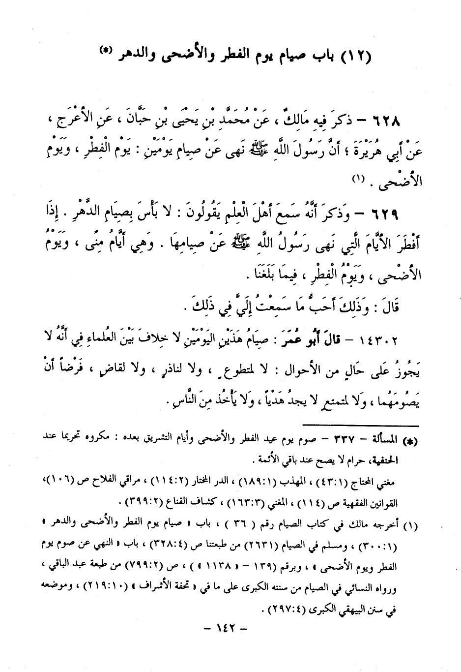 628 - ذَكَرَ فِيهِ مَالِكٌ، عَنْ مُحَمَّدِ بْنِ يَحْيَى بْنِ حِبَّانَ، عَنِ الْأَعْرَجِ، عَنْ أَبِي هُرَيْرَةَ ; أَنَّ رَسُولَ اللَّهِ - صَلَّى اللَّهُ عَلَيْهِ وَسَلَّمَ - نَهَى عَنْ صِيَامِ يَوْمَيْنِ: يَوْمِ الْفِطْرِ، وَيَوْمِ الْأَضْحَى.