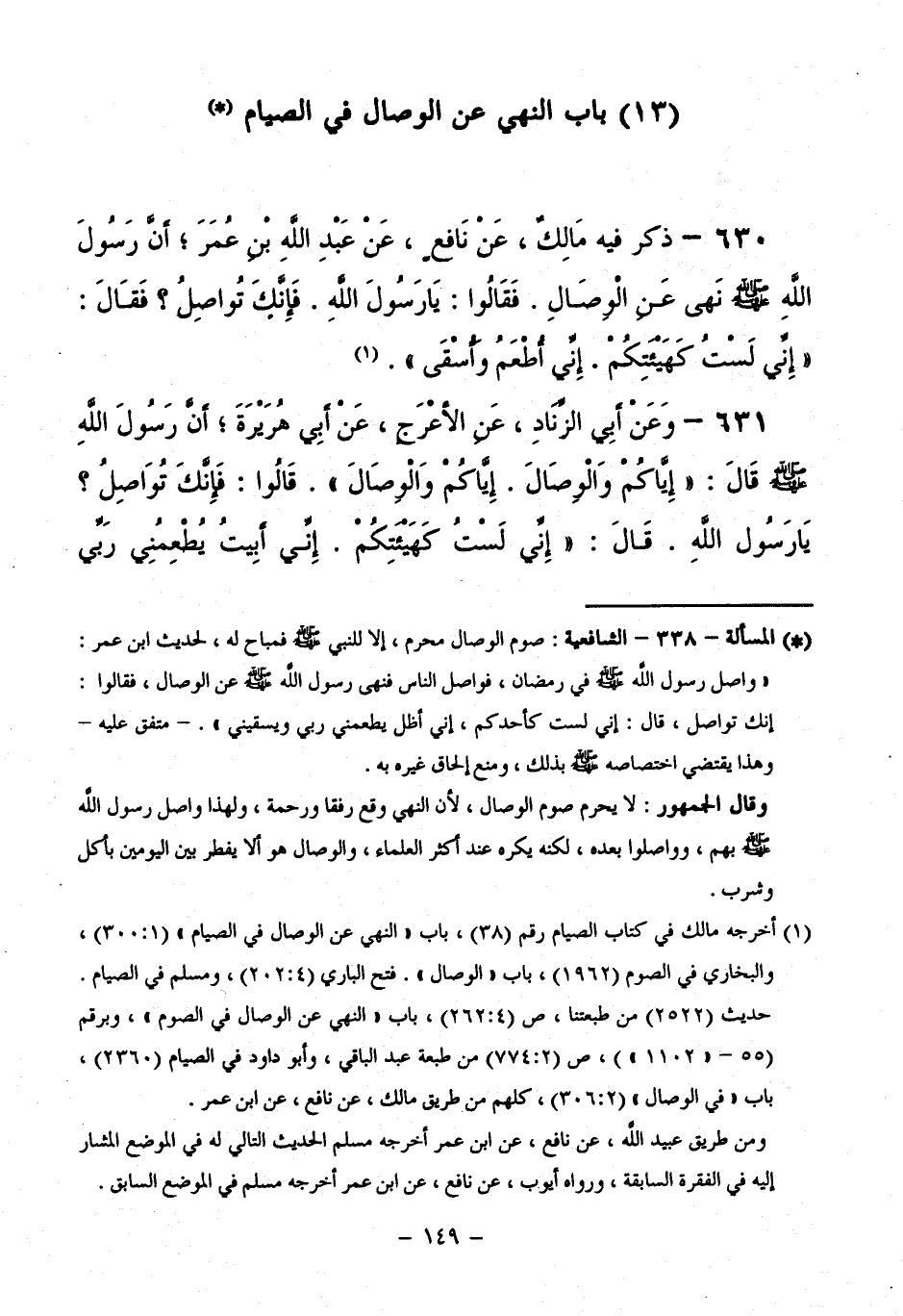 630 - ذَكَرَ فِيهِ مَالِكٌ، عَنْ نَافِعٍ، عَنْ عَبْدِ اللَّهِ بْنِ عُمَرَ، أَنَّ رَسُولَ اللَّهِ - صَلَّى اللَّهُ عَلَيْهِ وَسَلَّمَ - نَهَى عَنِ الْوِصَالِ. فَقَالُوا:. يَا رَسُولَ اللَّهِ فَإِنَّكَ تُوَاصِلُ ؟ فَقَالَ: " إِنِّي لَسْتُ كَهَيْئَتِكُمْ. إِنِّي أُطْعَمُ وَأُسْقَى.