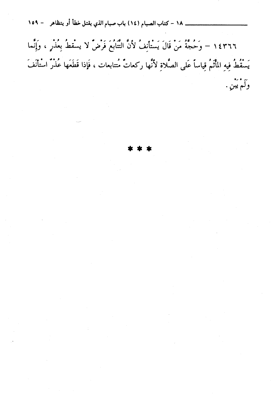 14366 - وَحُجَّةُ مَنْ قَالَ: يَسْتَأْنِفُ لِأَنَّ التَّتَابُعَ فَرْضٌ لَا يَسْقُطُ بِعُذْرٍ، وَإِنَّمَا يَسْقُطُ فِيهِ الْمَأْثَمُ قِيَاسًا عَلَى الصَّلَاةِ ؛ لِأَنَّهَا رَكَعَاتٌ مُتَتَابِعَاتٌ، فَإِذَا قَطَعَهَا عُذْرٌ اسْتَأْنَفَ وَلَمْ يَبْنِ.