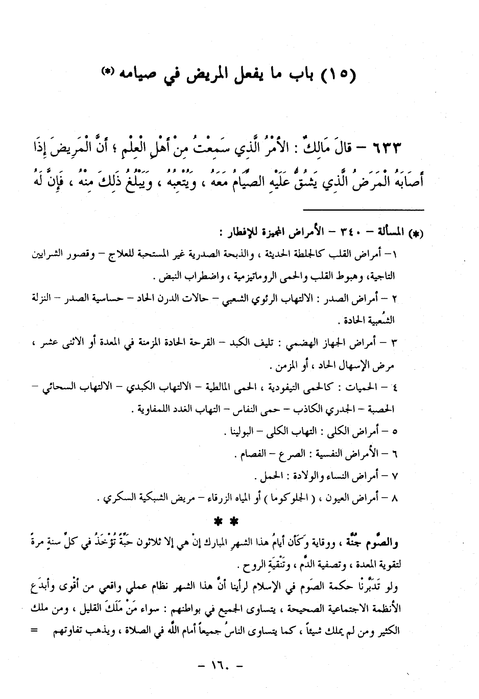 633 - قَالَ مَالِكٌ: الْأَمْرُ الَّذِي سَمِعْتُ مِنْ أَهْلِ الْعِلْمِ، أَنَّ الْمَرِيضَ إِذَا أَصَابَهُ الْمَرَضُ الَّذِي يَشُقُّ عَلَيْهِ الصِّيَامُ مَعَهُ، وَيُتْعِبُهُ، وَيَبْلُغُ ذَلِكَ ذَلِكَ مِنْهُ - فَإِنَّ لَهُ