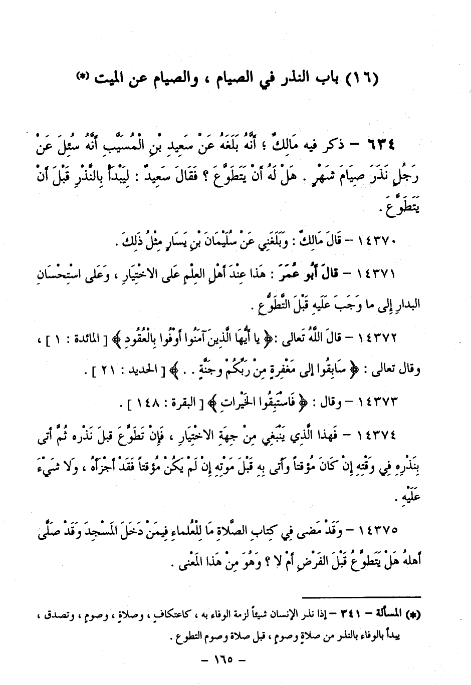 634 - ذَكَرَ فِيهِ مَالِكٌ، أَنَّهُ بَلَغَهُ عَنْ سَعِيدِ بْنِ الْمُسَيَّبِ أَنَّهُ سُئِلَ عَنْ رَجُلٍ نَذَرَ صِيَامَ شَهْرٍ، هَلْ لَهُ أَنْ يَتَطَوَّعَ ؟ فَقَالَ سَعِيدٌ: لِيَبْدَأْ بِالنَّذْرِ قَبْلَ أَنْ يَتَطَوَّعَ.