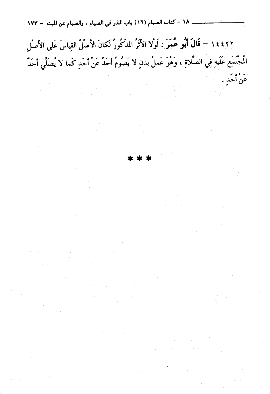 14422 - قَالَ أَبُو عُمَرَ: لَوْلَا الْأَثَرُ الْمَذْكُورُ لَكَانَ الْأَصْلُ الْقِيَاسُ عَلَى الْأَصْلِ الْمُجْتَمَعِ عَلَيْهِ فِي الصَّلَاةِ، وَهُوَ عَمَلُ بَدَنٍ، لَا يَصُومُ أَحَدٌ عَنْ أَحَدٍ كَمَا لَا يُصَلِّي أَحَدٌ عَنْ أَحَدٍ.