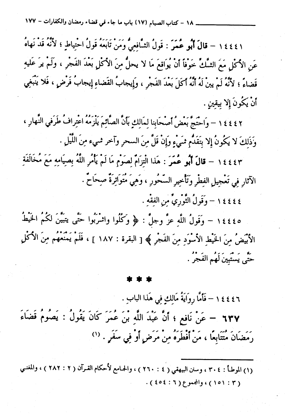 637 - عَنْ نَافِعٍ، أَنَّ عَبْدَ اللَّهِ بْنَ عُمَرَ كَانَ يَقُولُ: يَصُومُ قَضَاءَ رَمَضَانَ مُتَتَابِعًا مَنْ أَفْطَرَهُ مِنْ مَرَضٍ أَوْ فِي سَفَرٍ.