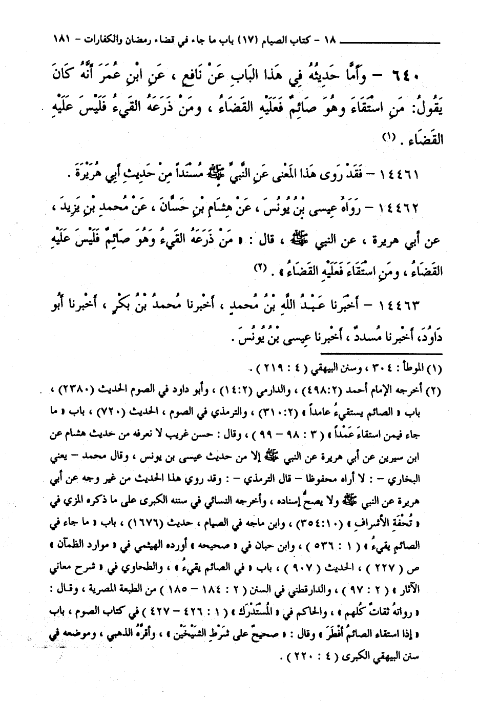 640 - وَأَمَّا حَدِيثُهُ فِي هَذَا الْبَابِ عَنْ نَافِعٍ، عَنِ ابْنِ عُمَرَ أَنَّهُ كَانَ يَقُولُ: مَنِ اسْتَقَاءَ وَهُوَ صَائِمٌ فَعَلَيْهِ الْقَضَاءُ، وَمَنْ ذَرَعَهُ الْقَيْءُ فَلَيْسَ عَلَيْهِ الْقَضَاءُ.
