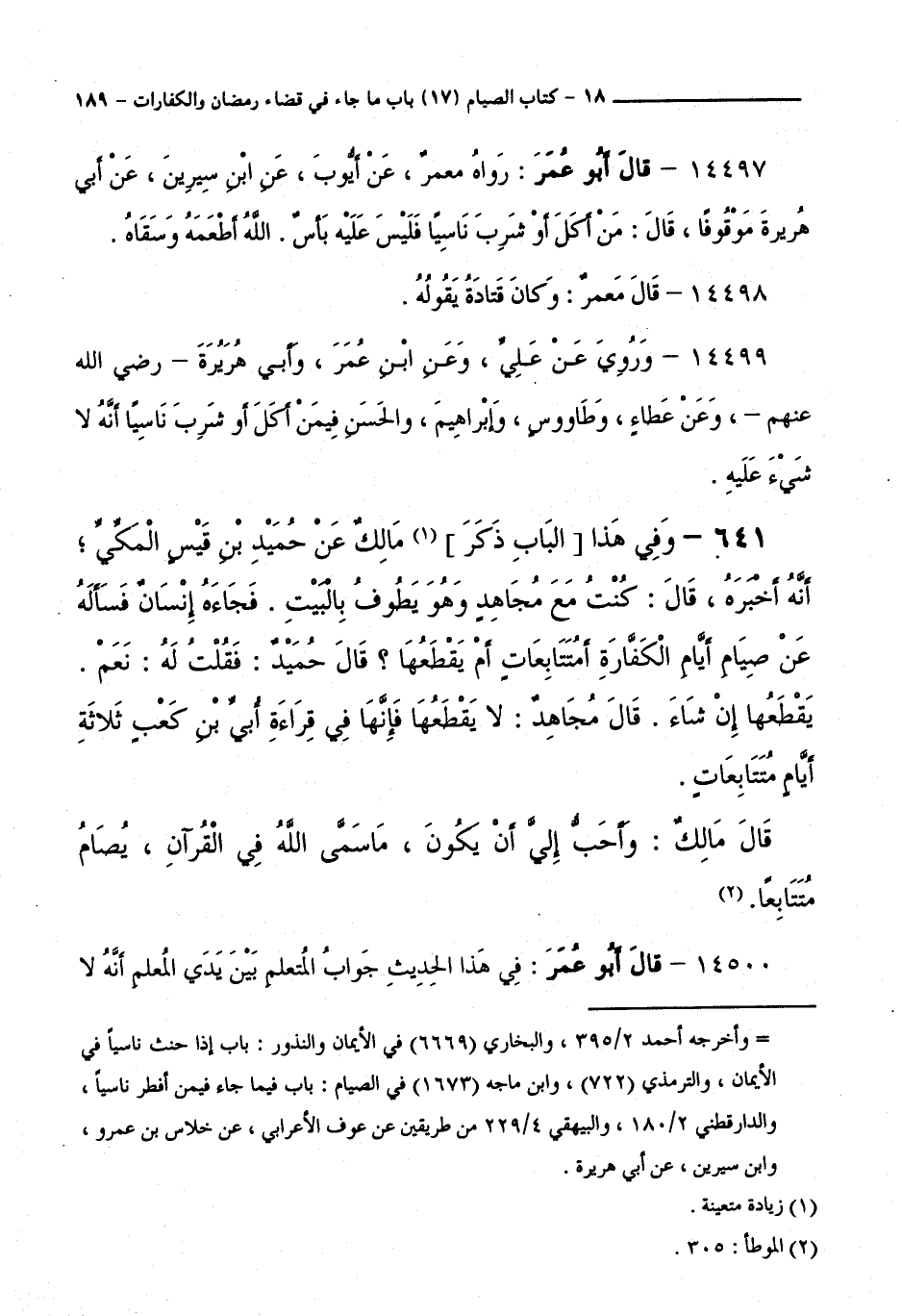 14499 - وَرُوِيَ عَنْ عَلِيٍّ، وَعَنِ ابْنِ عُمَرَ، وَأَبِي هُرَيْرَةَ - رَضِيَ اللَّهُ عَنْهُمْ - وَعَنْ عَطَاءٍ، وَطَاوُسٍ، وَإِبْرَاهِيمَ، وَالْحَسَنِ فِيمَنْ أَكَلَ أَوْ شَرِبَ نَاسِيًا أَنَّهُ لَا شَيْءَ عَلَيْهِ.
