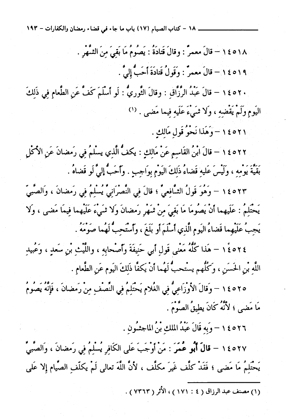 14520 - قَالَ: عَبْدُ الرَّزَّاقِ: وَقَالَ الثَّوْرِيُّ: لَوْ أَسْلَمَ كَفَّ عَنِ الطَّعَامِ فِي ذَلِكَ الْيَوْمِ وَلَمْ يَقْضِهِ، وَلَا شَيْءَ عَلَيْهِ فِيمَا مَضَى.