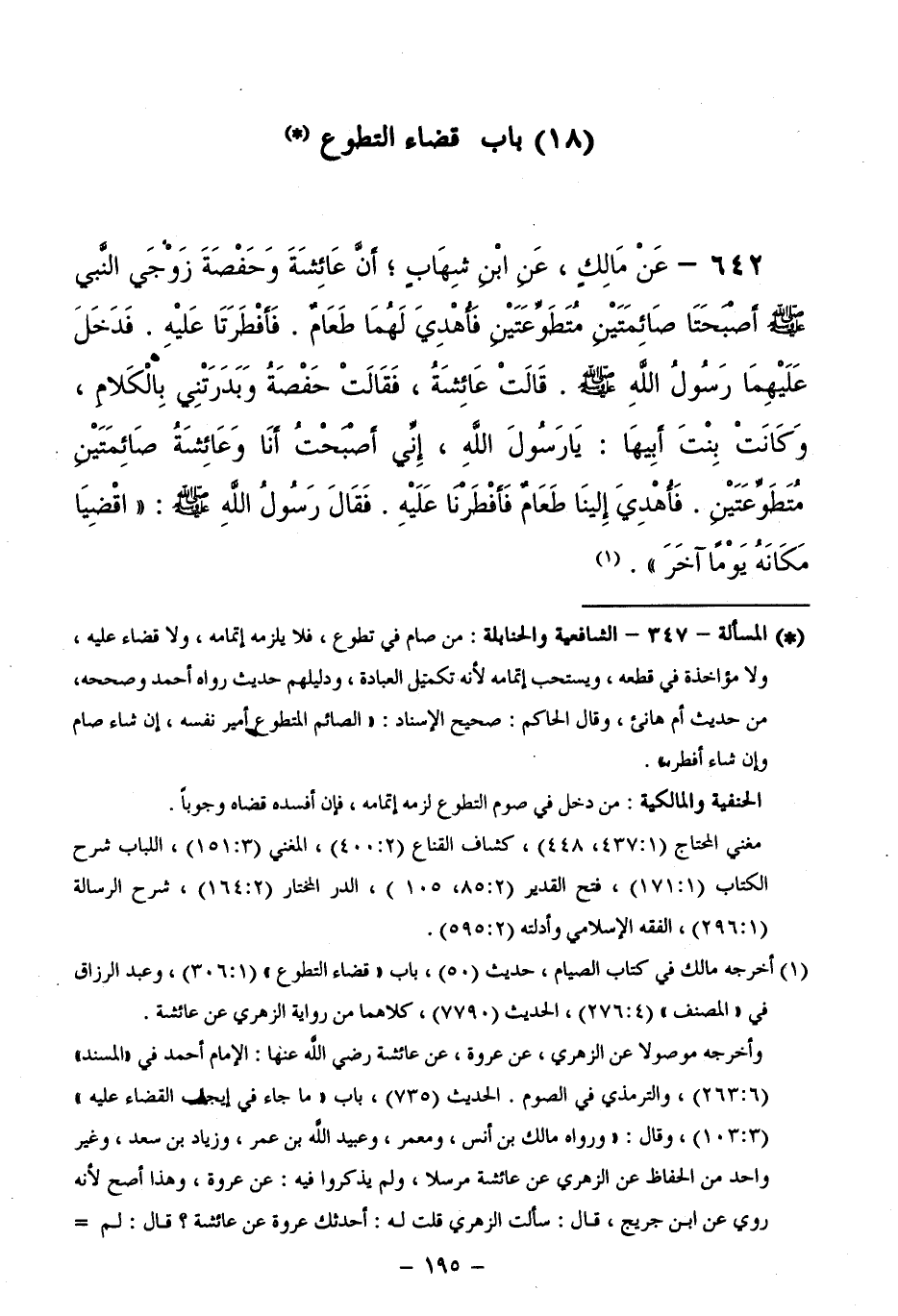 642 - عَنْ مَالِكٍ، عَنِ ابْنِ شِهَابٍ ; أَنَّ عَائِشَةَ وَحَفْصَةَ زَوْجَيِ النَّبِيِّ - صَلَّى اللَّهُ عَلَيْهِ وَسَلَّمَ - أَصْبَحَتَا صَائِمَتَيْنِ مُتَطَوِّعَتَيْنِ، فَأُهْدِيَ لَهُمَا طَعَامٌ، فَأَفْطَرَتَا عَلَيْهِ. فَدَخَلَ عَلَيْهِمَا رَسُولُ اللَّهِ - صَلَّى اللَّهُ عَلَيْهِ وَسَلَّمَ - قَالَتْ عَائِشَةُ، فَقَالَتْ حَفْصَةُ - وَبَدَرَتْنِي بِالْكَلَامِ وَكَانَتْ بِنْتَ أَبِيهَا -: يَا رَسُولَ اللَّهِ، إِنِّي أَصْبَحْتُ أَنَا وَعَائِشَةُ صَائِمَتَيْنِ مُتَطَوِّعَتَيْنِ، فَأُهْدِيَ إِلَيْنَا طَعَامٌ فَأَفْطَرْنَا عَلَيْهِ. فَقَالَ رَسُولُ اللَّهِ - صَلَّى اللَّهُ عَلَيْهِ وَسَلَّمَ -: " اقْضِيَا مَكَانَهُ يَوْمًا آخَرَ ".