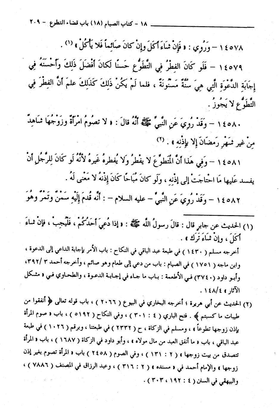14580 - وَقَدْ رُوِيَ عَنِ النَّبِيِّ - صَلَّى اللَّهُ عَلَيْهِ وَسَلَّمَ - أَنَّهُ قَالَ: " لَا تَصُومُ امْرَأَةٌ وَزَوْجُهَا شَاهِدٌ - مِنْ غَيْرِ شَهْرِ رَمَضَانَ - إِلَّا بِإِذْنِهِ ".