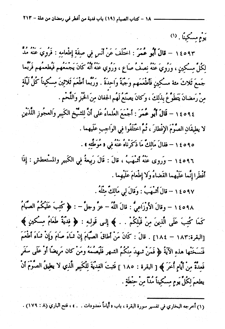 14598 - وَقَالَ الْأَوْزَاعِيُّ: قَالَ اللَّهُ - عَزَّ وَجَلَّ -:كُتِبَ عَلَيْكُمُ الصِّيَامُ كَمَا كُتِبَ عَلَى الَّذِينَ مِنْ قَبْلِكُمْ إِلَى قَوْلِهِ:فِدْيَةٌ طَعَامُ مِسْكِينٍ [ الْبَقَرَةِ: 183 - 184 ]. قَالَ: كَانَ مَنْ أَطَاقَ الصِّيَامَ إِنْ شَاءَ صَامَ وَإِنْ شَاءَ أَطْعَمَ فَنَسَخَتْهَا هَذِهِ الْآيَةُفَمَنْ شَهِدَ مِنْكُمُ الشَّهْرَ فَلْيَصُمْهُ وَمَنْ كَانَ مَرِيضًا أَوْ عَلَى سَفَرٍ فَعِدَّةٌ مِنْ أَيَّامٍ أُخَرَ [ الْبَقَرَةِ: 185 ] فَثَبَتَ الْفِدْيَةَ لِلْكَبِيرِ الَّذِي لَا يُطِيقُ الصَّوْمَ أَنْ يُطْعِمَ لِكُلِّ يَوْمٍ مِسْكِينًا مُدًّا مِنْ حِنْطَةٍ.