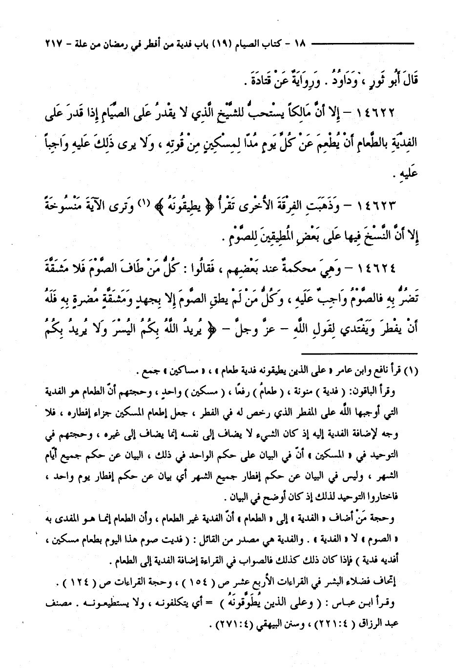 14623 - وَذَهَبَتِ الْفِرْقَةُ الْأُخْرَى تَقْرَأُ يُطِيقُونَهُ وَتَرَى الْآيَةَ مَنْسُوخَةً إِلَّا أَنَّ النَّسْخَ فِيهَا عَلَى بَعْضِ الْمُطِيقِينَ لِلصَّوْمِ.