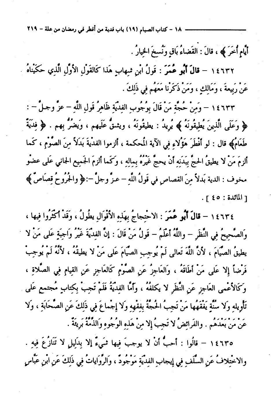 14633 - وَمِنْ حُجَّةِ مَنْ قَالَ بِوُجُوبِ الْفِدْيَةِ ظَاهِرُ قَوْلِ اللَّهِ - عَزَّ وَجَلَّ -:وَعَلَى الَّذِينَ يُطِيقُونَهُ يُرِيدُ: يُطِيقُونَهُ، وَيَشُقُّ عَلَيْهِمْ، وَيَضُرُّ بِهِمْ فَدِيَةٌ طَعَامُ قَالَ: لَوْ أَفْطَرَ هَؤُلَاءِ فِي الْآيَةِ الْمُحْكَمَةِ، أُلْزِمُوا الْفِدْيَةَ بَدَلًا مِنَ الصَّوْمِ، كَمَا أُلْزِمَ مَنْ لَا يُطِيقُ الْحَجَّ بِبَدَنِهِ أَنْ يَحُجَّ غَيْرُهُ بِمَالِهِ، وَكَمَا أَلْزَمَ الْجَمِيعُ الْجَانِيَ عَلَى عُضْوٍ مُخَوِّفٍ الدِّيَةَ بَدَلًا مِنَ الْقِصَاصِ فِي قَوْلِ اللَّهِ - عَزَّ وَجَلَّ -:وَالْجُرُوحَ قِصَاصٌ [ الْمَائِدَةِ: 45 ].