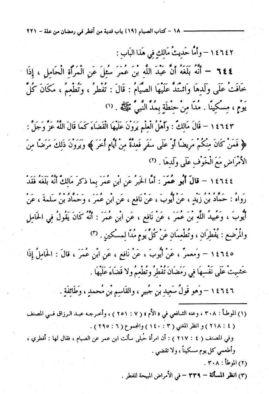 644 - أَنَّهُ بَلَغَهُ أَنَّ عَبْدَ اللَّهِ بْنَ عُمَرَ سُئِلَ عَنِ الْمَرْأَةِ الْحَامِلِ، إِذَا خَافَتَ عَلَى وَلَدِهَا وَاشْتَدَّ عَلَيْهَا الصِّيَامُ قَالَ: تُفْطِرُ، وَتُطْعِمُ مَكَانَ كُلِّ يَوْمٍ مِسْكِينًا مُدًّا مِنْ حِنْطَةٍ بِمُدِّ النَّبِيِّ - صَلَّى اللَّهُ عَلَيْهِ وَسَلَّمَ -.
