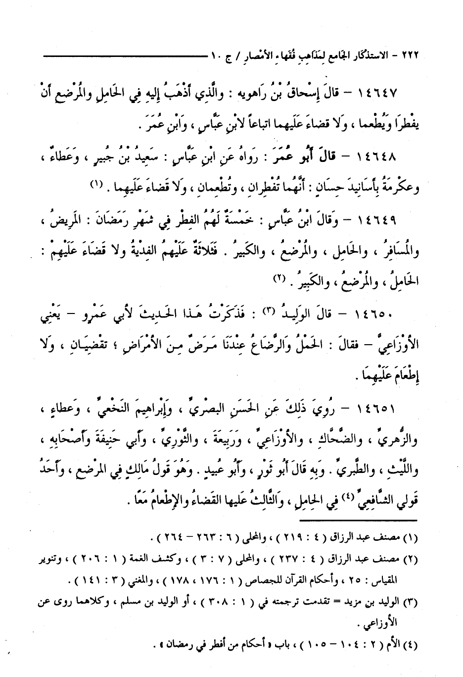 14650 - قَالَ الْوَلِيدُ: فَذَكَرْتُ هَذَا الْحَدِيثَ لِأَبِي عَمْرٍو - يَعْنِي الْأَوْزَاعِيَّ - فَقَالَ: الْحَمْلُ وَالرَّضَاعُ عِنْدَنَا مَرَضٌ مِنَ الْأَمْرَاضِ، تَقْضِيَانِ وَلَا إِطْعَامَ عَلَيْهِمَا.