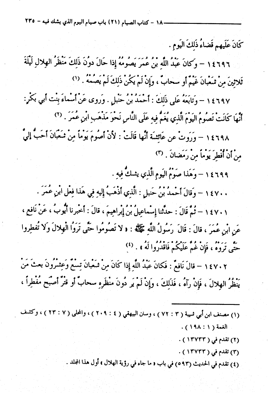 14702 - قَالَ نَافِعٌ: فَكَانَ عَبْدُ اللَّهِ إِذَا كَانَ مِنْ شَعْبَانَ تِسْعٌ وَعِشْرُونَ بَعَثَ مَنْ يَنْطُرُ الْهِلَالَ، فَإِنْ رَآهُ فَذَلِكَ، وَإِنْ لَمْ يَرَ دُونَ مَنْظَرِهِ سَحَابٌ أَوْ قَتَرٌ أَصْبَحَ مُفْطِرًا،