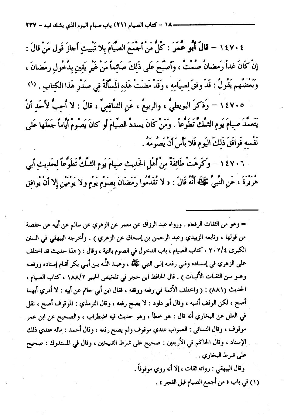14706 - وَكَرِهَتْ طَائِفَةٌ مِنْ أَهْلِ الْحَدِيثِ صِيَامَ يَوْمِ الشَّكِّ تَطَوُّعًا لِحَدِيثِ أَبِي هُرَيْرَةَ، عَنِ النَّبِيِّ - صَلَّى اللَّهُ عَلَيْهِ وَسَلَّمَ - أَنَّهُ قَالَ: " لَا تَقَدَّمُوا رَمَضَانَ بِصَوْمِ يَوْمٍ وَلَا يَوْمَيْنِ إِلَّا أَنْ يُوَافِقَ
