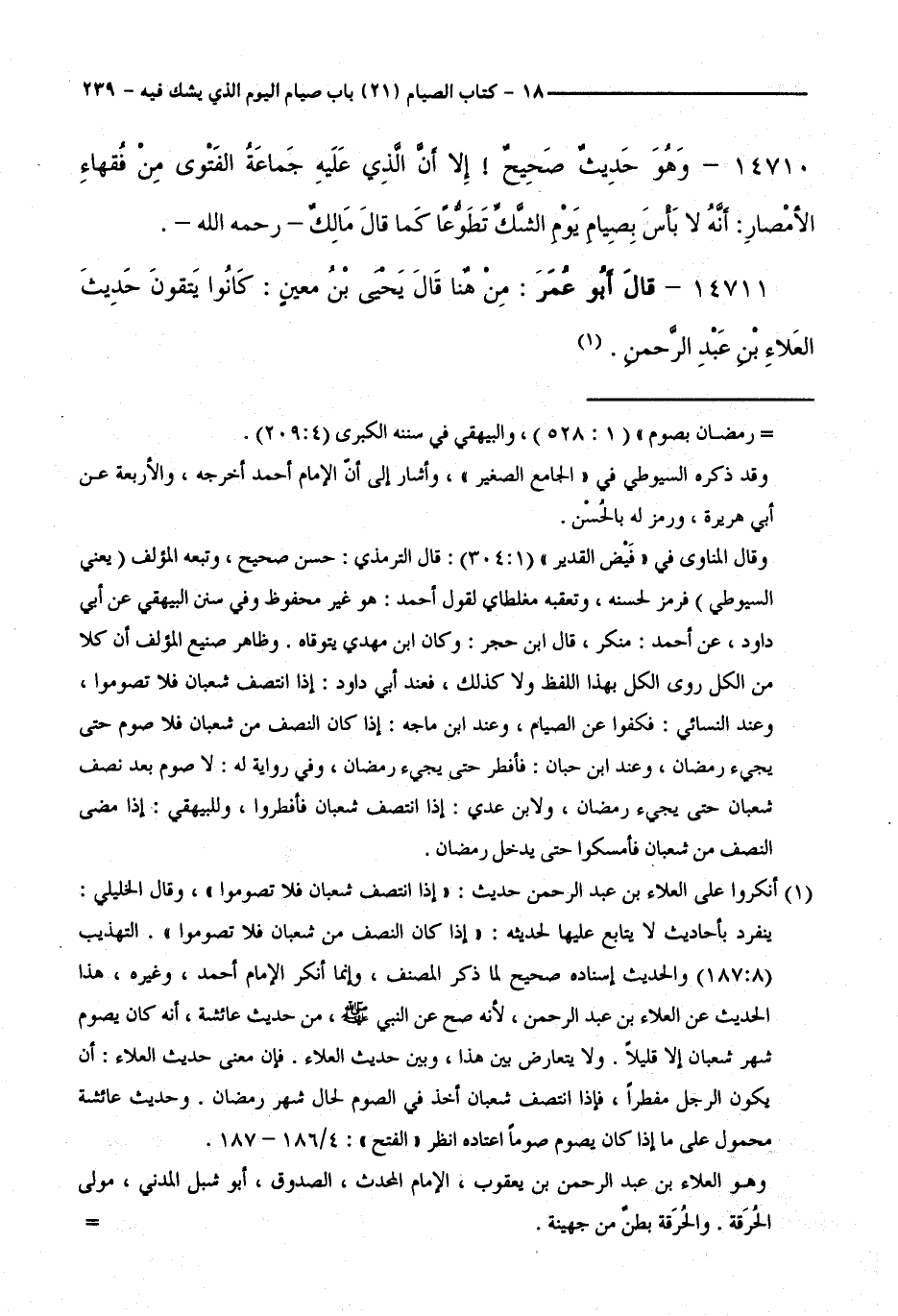 14710 - وَهُوَ حَدِيثٌ صَحِيحٌ، إِلَّا أَنَّ الَّذِي عَلَيْهِ جَمَاعَةُ الْفَتْوَى مِنْ فُقَهَاءِ الْأَمْصَارِ، أَنَّهُ لَا بَأْسَ بِصِيَامِ يَوْمِ الشَّكِّ تَطَوُّعًا كَمَا قَالَ مَالِكٌ - رَحِمَهُ اللَّهُ -.