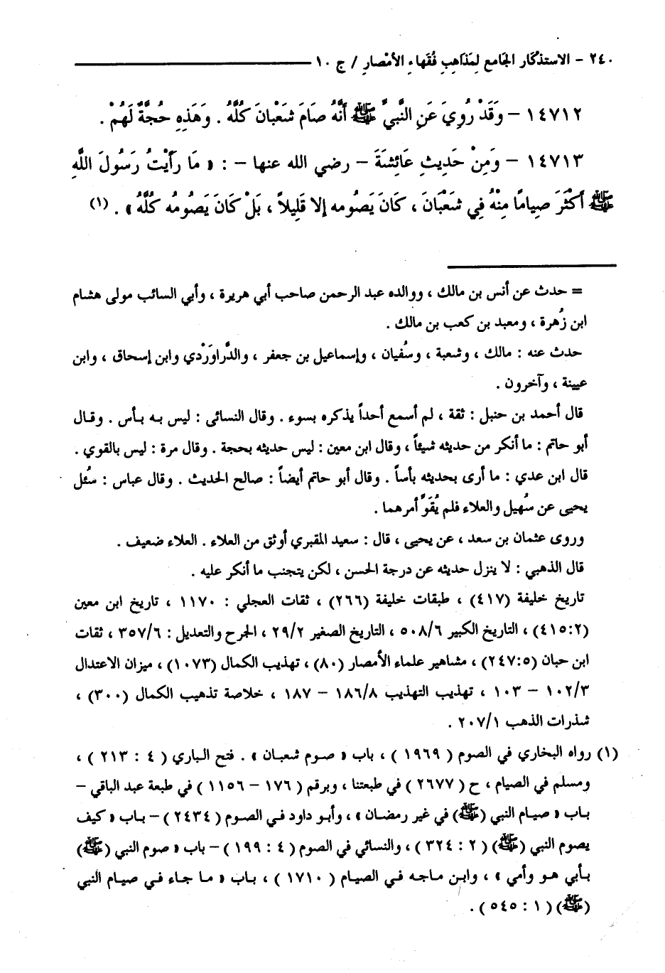 14712 - وَقَدْ رُوِيَ عَنِ النَّبِيِّ - صَلَّى اللَّهُ عَلَيْهِ وَسَلَّمَ - أَنَّهُ صَامَ شَعْبَانَ كُلَّهُ. وَهَذِهِ حُجَّةٌ لَهُمْ.