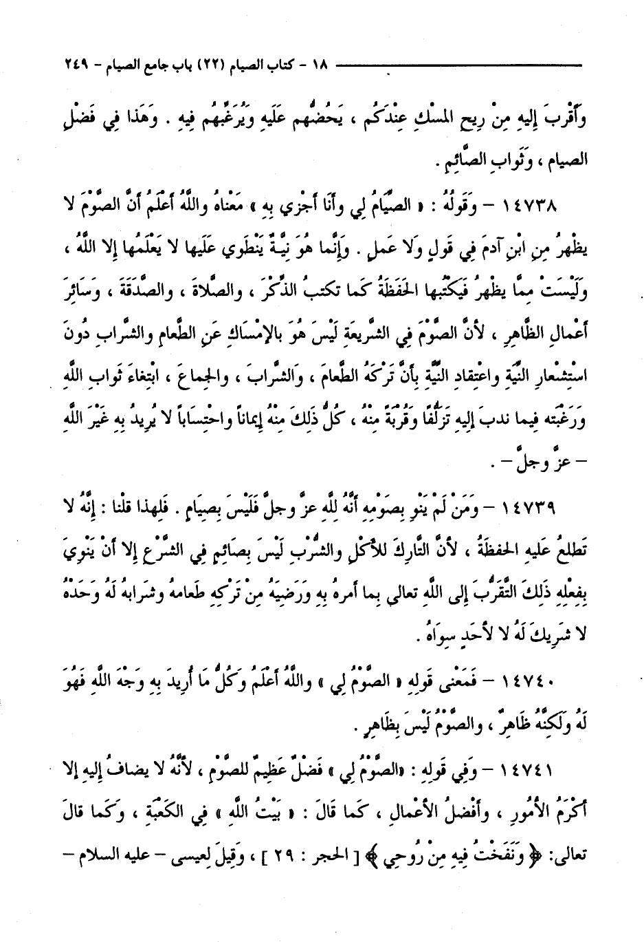 14741 - وَفِي قَوْلِهِ: " الصَّوْمُ لِي " فَضْلٌ عَظِيمٌ لِلصَّوْمِ ؛ لِأَنَّهُ لَا يُضَافُ إِلَيْهِ إِلَّا أَكْرَمُ الْأُمُورِ، وَأَفْضَلُ الْأَعْمَالِ، كَمَا قَالَ: " بَيْتُ اللَّهِ " فِي الْكَعْبَةِ، وَكَمَا قَالَ تَعَالَى:وَنَفَخْتُ فِيهِ مِنْ رُوحِي [ الْحِجْرِ: 29 ]، وَقِيلَ لِعِيسَى - عَلَيْهِ السَّلَامُ -: