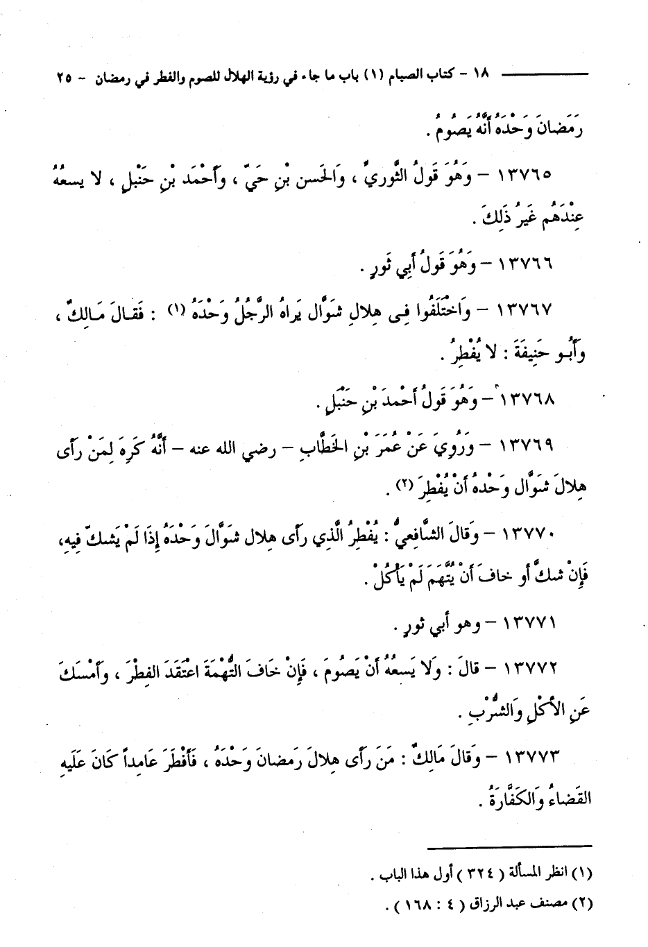13769 - وَرُوِيَ عَنْ عُمَرَ بْنِ الْخَطَّابِ - رَضِيَ اللَّهُ عَنْهُ - أَنَّهُ كَرِهَ لِمَنْ رَأَى هِلَالَ شَوَّالٍ وَحْدَهُ أَنْ يُفْطِرَ.