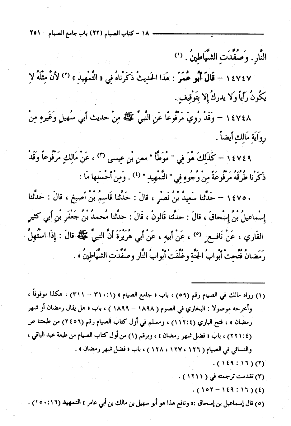 14749 - كَذَلِكَ هُوَ فِي " مُوَطَّأِ " مَعْنِ بْنِ عِيسَى، عَنْ مَالِكٍ مَرْفُوعًا، وَقَدْ ذَكَرْنَا طُرُقَهُ مَرْفُوعَةً مِنْ وُجُوهٍ فِي " التَّمْهِيدِ ". وَمِنْ أَحْسَنِهَا مَا: 14750 - حَدَّثَنَا سَعِيدُ بْنُ نَصْرٍ قَالَ: حَدَّثَنَا قَاسِمُ بْنُ أَصْبَغَ قَالَ: حَدَّثَنَا إِسْمَاعِيلُ بْنُ إِسْحَاقَ قَالَ: حَدَّثَنَا قَالُونُ قَالَ: حَدَّثَنَا مُحَمَّدُ بْنُ جَعْفَرِ بْنِ أَبِي كَثِيرٍ الْقَارِئُ، عَنْ نَافِعٍ، عَنْ أَبِيهِ، عَنْ أَبِي هُرَيْرَةَ أَنَّ النَّبِيَّ - صَلَّى اللَّهُ عَلَيْهِ وَسَلَّمَ - قَالَ: إِذَا اسْتُهِلَّ رَمَضَانُ فُتِّحَتْ أَبْوَابُ الْجَنَّةِ، وَغُلِّقَتْ أَبْوَابُ النَّارِ، وَصُفِّدَتِ الشَّيَاطِينُ.