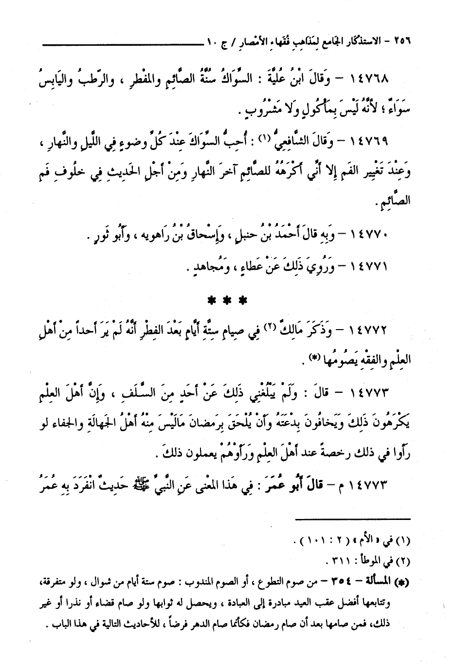 14772 - وَذَكَرَ مَالِكٌ فِي صِيَامِ سِتَّةِ أَيَّامٍ بَعْدَ الْفِطْرِ أَنَّهُ لَمْ يَرَ أَحَدًا مِنْ أَهْلِ الْعِلْمِ وَالْفِقْهِ يَصُومُهَا.