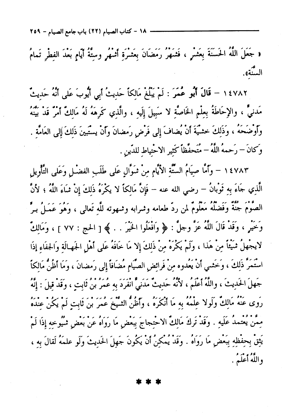 14783 - وَأَمَّا صِيَامُ السِّتَّةِ الْأَيَّامِ مِنْ شَوَّالٍ عَلَى طَلَبِ الْفَضْلِ وَعَلَى التَّأْوِيلِ الَّذِي جَاءَ بِهِ ثَوْبَانُ - رَضِيَ اللَّهُ عَنْهُ - فَإِنَّ مَالِكًا لَا يَكْرَهُ ذَلِكَ إِنْ شَاءَ اللَّهُ ; لِأَنَّ الصَّوْمَ جُنَّةٌ وَفَضْلُهُ مَعْلُومٌ لِمَنْ رَدَّ طَعَامَهُ وَشَرَابَهُ وَشَهْوَتَهُ لِلَّهِ تَعَالَى، وَهُوَ عَمَلُ بِرٍّ وَخَيْرٍ، وَقَدْ قَالَ اللَّهُ عَزَّ وَجَلَّ:وَافْعَلُوا الْخَيْرَ [ الْحَجِّ: 77 ]، وَمَالِكٌ لَا يَجْهَلُ شَيْئًا مِنْ هَذَا، وَلَمْ يَكْرَهْ مِنْ ذَلِكَ إِلَّا مَا خَافَهُ عَلَى أَهْلِ الْجَهَالَةِ وَالْجَفَاءِ إِذَا اسْتَمَرَّ ذَلِكَ، وَخَشِيَ أَنْ يَعُدُّوهُ مِنْ فَرَائِضِ الصِّيَامِ مُضَافًا إِلَى رَمَضَانَ، وَمَا أَظُنُّ مَالِكًا جَهِلَ الْحَدِيثَ - وَاللَّهُ أَعْلَمُ - لِأَنَّهُ حَدِيثٌ مَدَنِيٌّ انْفَرَدَ بِهِ عُمَرُ بْنُ ثَابِتٍ، وَقَدْ قِيلَ: إِنَّهُ رَوَى عَنْهُ مَالِكٌ، وَلَوْلَا عِلْمُهُ بِهِ مَا أَنْكَرَهُ، وَأَظُنُّ الشَّيْخَ عُمَرَ بْنَ ثَابِتٍ لَمْ يَكُنْ عِنْدَهُ مِمَّنْ يُعْتَمَدُ عَلَيْهِ. وَقَدْ تَرَكَ مَالِكٌ الِاحْتِجَاجَ بِبَعْضِ مَا رَوَاهُ عَنْ بَعْضِ شُيُوخِهِ إِذَا لَمْ يَثِقْ بِحِفْظِهِ بِبَعْضِ مَا رَوَاهُ. وَقَدْ يُمْكِنُ أَنْ يَكُونَ جَهِلَ الْحَدِيثَ، وَلَوْ عَلِمَهُ لَقَالَ بِهِ، وَاللَّهُ أَعْلَمُ.