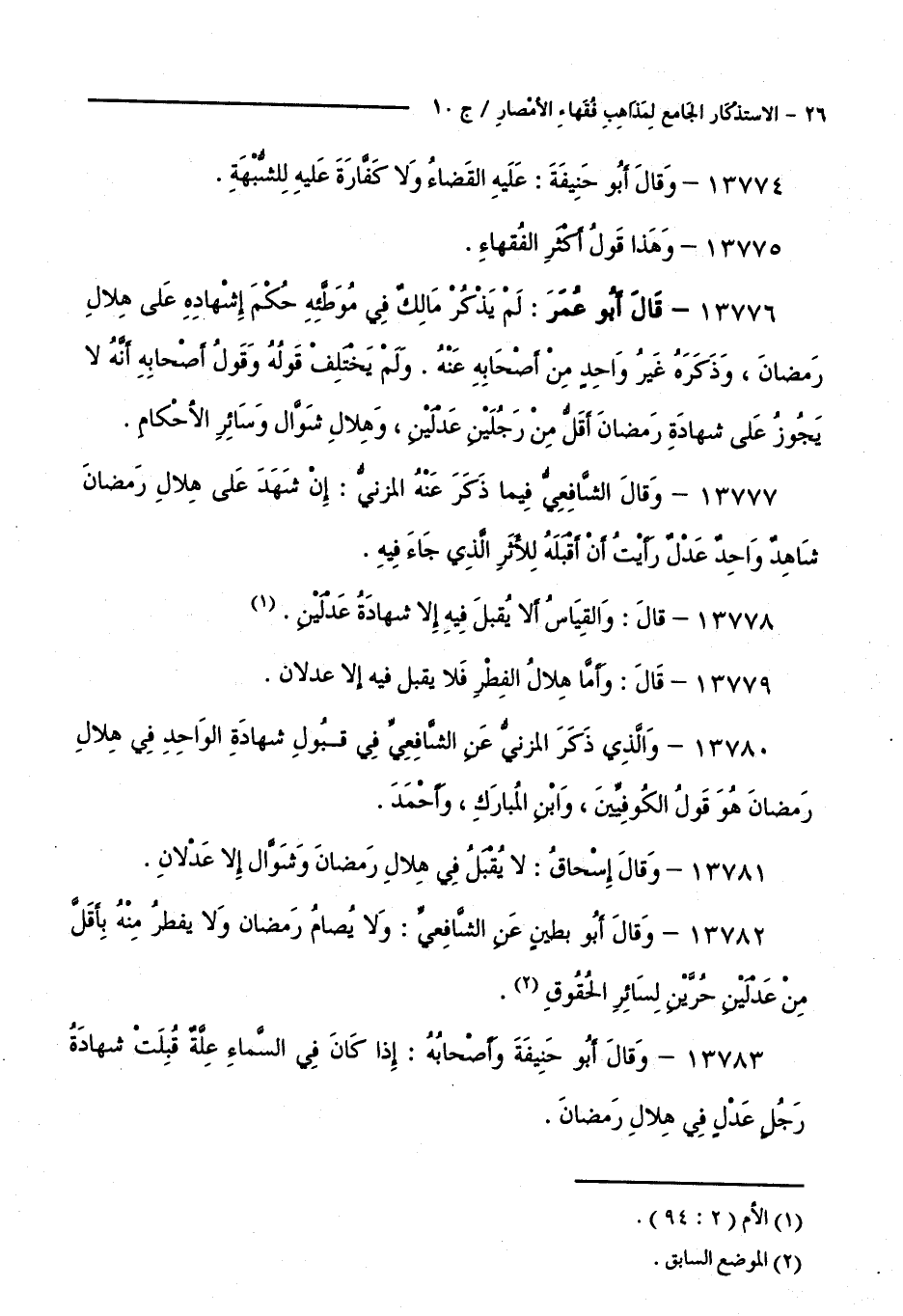 13776 - قَالَ أَبُو عُمَرَ: لَمْ يَذْكُرْ مَالِكٌ فِي مُوَطَّئِهِ حُكْمَ إِشْهَادِهِ عَلَى هِلَالِ رَمَضَانَ، وَذَكَرَهُ غَيْرُ وَاحِدٍ مِنْ أَصْحَابِهِ عَنْهُ، وَلَمْ يَخْتَلِفْ قَوْلُهُ وَقَوْلُ أَصْحَابِهِ أَنَّهُ لَا يَجُوزُ عَلَى شَهَادَةِ رَمَضَانَ أَقَلُّ مِنْ رَجُلَيْنِ عَدْلَيْنِ، وَهِلَالِ شَوَّالٍ، وَسَائِرِ الْأَحْكَامِ.