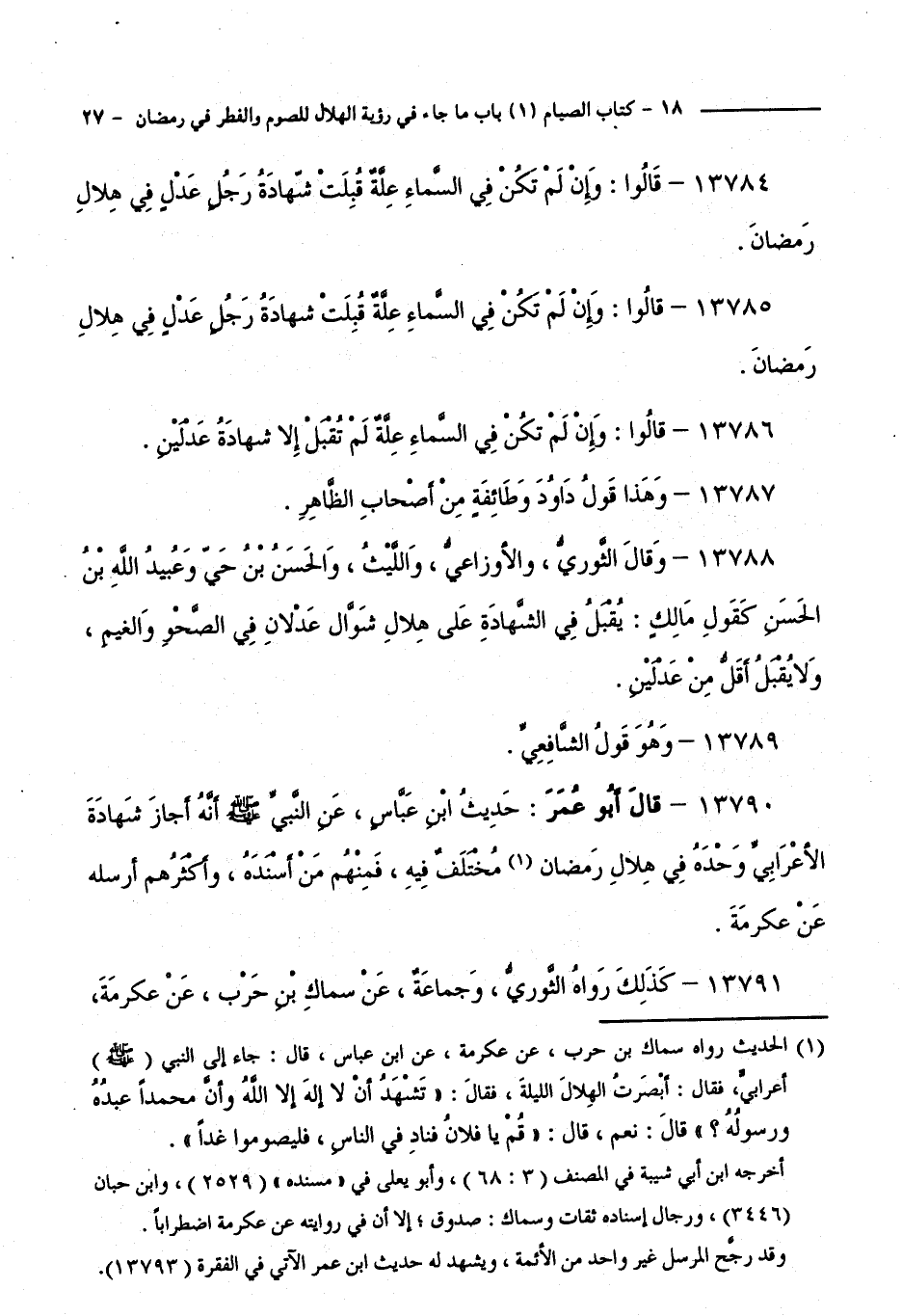 13790 - قَالَ أَبُو عُمَرَ: حَدِيثُ ابْنِ عَبَّاسٍ، عَنِ النَّبِيِّ - صَلَّى اللَّهُ عَلَيْهِ وَسَلَّمَ - أَنَّهُ أَجَازَ شَهَادَةَ الْأَعْرَابِيِّ وَحْدَهُ فِي هِلَالِ رَمَضَانَ، مُخْتَلَفٌ فِيهِ، فَمِنْهُمْ مَنْ أَسْنَدَهُ، وَأَكْثَرُهُمْ أَرْسَلَهُ عَنْ عِكْرِمَةَ.