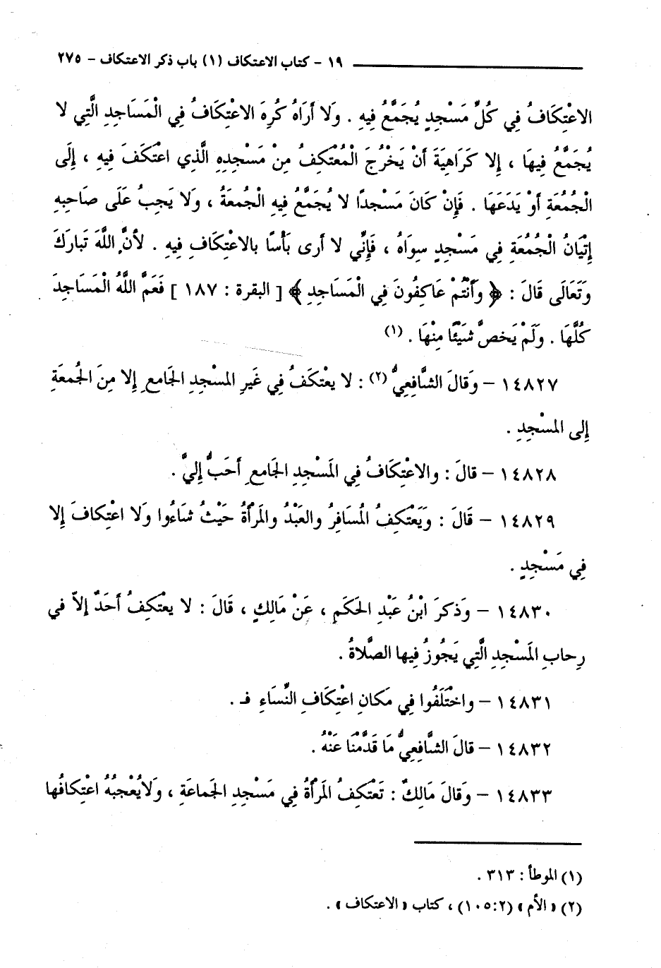14829 - قَالَ: وَيَعْتَكِفُ الْمُسَافِرُ وَالْعَبْدُ وَالْمَرْأَةُ حَيْثُ شَاءُوا وَلَا اعْتِكَافَ إِلَّا فِي مَسْجِدٍ.