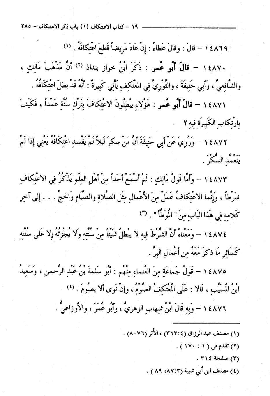 14871 - قَالَ أَبُو عُمَرَ: هَؤُلَاءِ يُبْطِلُونَ الِاعْتِكَافَ بِتَرْكِ سُنَّةٍ عَمْدًا، فَكَيْفَ بِارْتِكَابِ الْكَبِيرَةِ فِيهِ ؟.