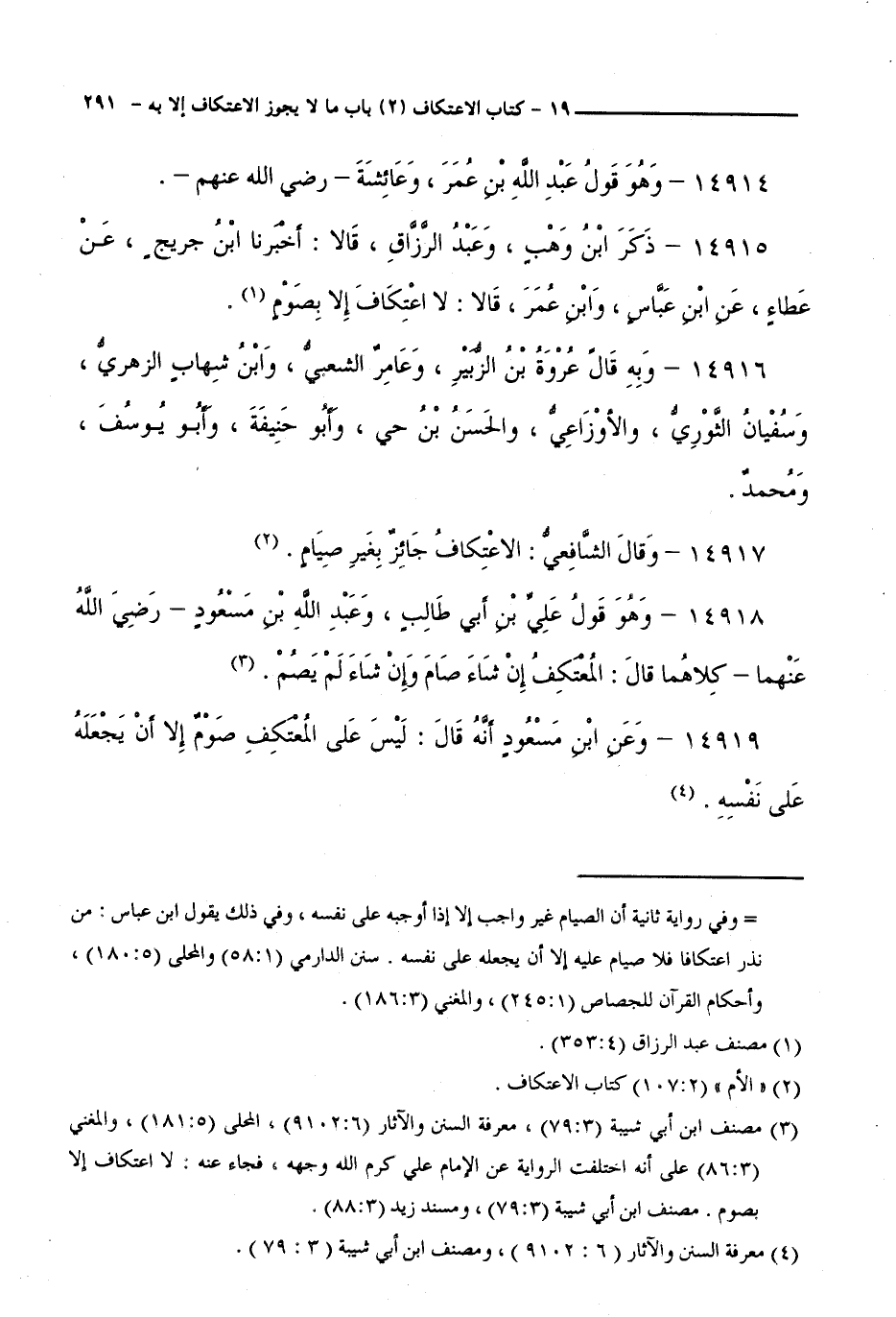 14919 - وَعَنِ ابْنِ مَسْعُودٍ أَنَّهُ قَالَ: لَيْسَ عَلَى الْمُعْتَكِفِ صَوْمٌ إِلَّا أَنْ يَجْعَلَهُ عَلَى نَفْسِهِ.