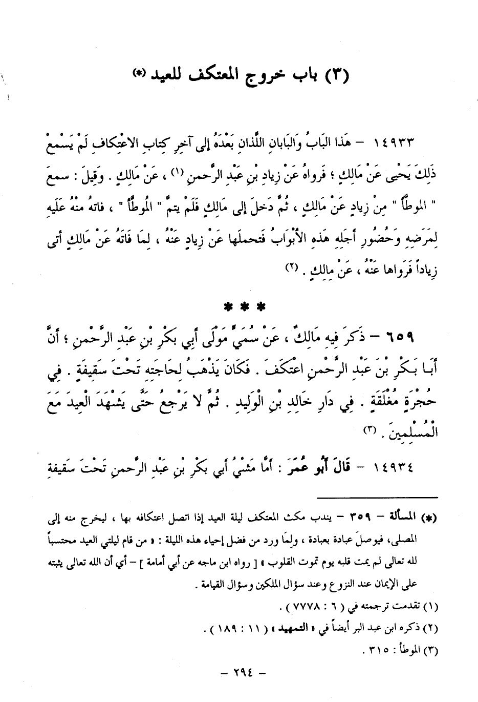 14933 - هَذَا الْبَابُ وَالْبَابَانِ اللَّذَانِ بَعْدَهُ إِلَى آخِرِ كِتَابِ الِاعْتِكَافِ لَمْ يَسْمَعْ ذَلِكَ يَحْيَى عَنْ مَالِكٍ ; فَرَوَاهُ عَنْ زِيَادِ بْنِ عَبْدِ الرَّحْمَنِ، عَنْ مَالِكٍ، وَقِيلَ: سَمِعَ " الْمُوَطَّأَ " مِنْ زِيَادٍ عَنْ مَالِكٍ، ثُمَّ دَخَلَ إِلَى مَالِكٍ، فَلَمْ يُتِمَّ " الْمُوَطَّأَ "، فَاتَهُ مِنْهُ عَلَيْهِ - لِمَرَضِهِ وَحُضُورِ أَجَلِهِ - هَذِهِ الْأَبْوَابُ فَتَحَمَّلَهَا عَنْ زِيَادٍ عَنْهُ، لِمَا فَاتَهُ عَنْ مَالِكٍ أَتَى زِيَادًا فَرَوَاهَا عَنْهُ، عَنْ مَالِكٍ.
