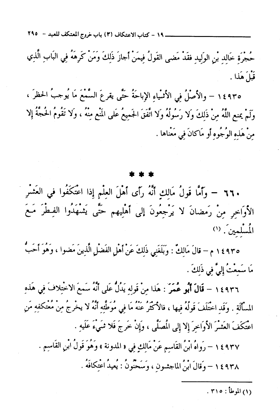 660 - وَأَمَّا قَوْلُ مَالِكٍ: إِنَّهُ رَأَى أَهْلَ الْعِلْمِ إِذَا اعْتَكَفُوا فِي الْعَشْرِ الْأَوَاخِرِ مِنْ رَمَضَانَ لَا يَرْجِعُونَ إِلَى أَهْلِيهِمْ حَتَّى يَشْهَدُوا الْفِطْرَ مَعَ الْمُسْلِمِينَ.