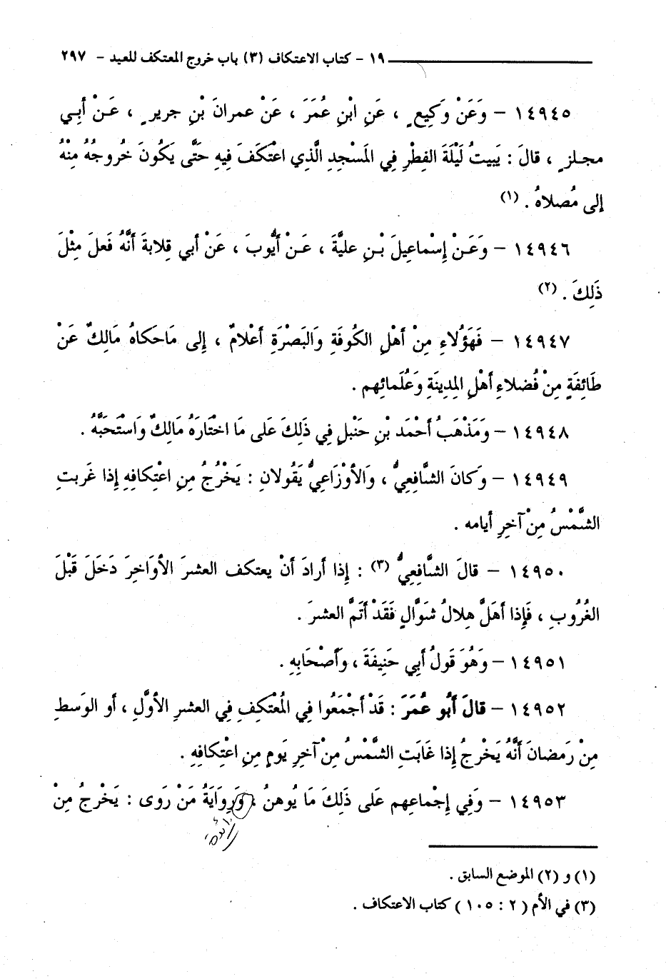 14949 - وَكَانَ الشَّافِعِيُّ، وَالْأَوْزَاعِيُّ يَقُولَانِ: يَخْرُجُ مِنِ اعْتِكَافِهِ إِذَا غَرَبَتِ الشَّمْسُ مِنْ آخِرِ أَيَّامِهِ.