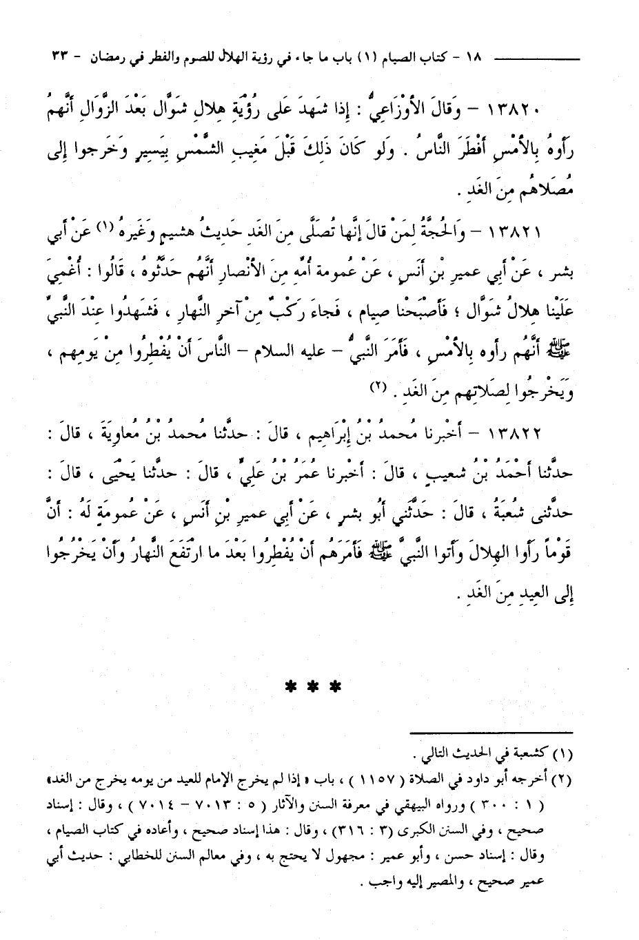 13822 - أَخْبَرَنَا مُحَمَّدُ بْنُ إِبْرَاهِيمَ، قَالَ: حَدَّثَنَا مُحَمَّدُ بْنُ مُعَاوِيَةَ، قَالَ حَدَّثَنَا أَحْمَدُ بْنُ شُعَيْبٍ، قَالَ: أَخْبَرَنَا عُمَرُ بْنُ عَلِيٍّ، قَالَ: حَدَّثَنَا يَحْيَى، قَالَ: حَدَّثَنِي شُعْبَةُ، قَالَ: حَدَّثَنِي أَبُو بِشْرٍ، عَنْ أَبِي عُمَيْرِ بْنِ أَنَسٍ، عَنْ عُمُومَةٍ لَهُ، أَنَّ قَوْمًا رَأَوُا الْهِلَالَ وَأَتَوُا النَّبِيَّ - صَلَّى اللَّهُ عَلَيْهِ وَسَلَّمَ -، فَأَمَرَهُمْ أَنْ يُفْطِرُوا بَعْدَ مَا ارْتَفَعَ النَّهَارُ، وَأَنْ يَخْرُجُوا إِلَى الْعِيدِ مِنَ الْغَدِ.