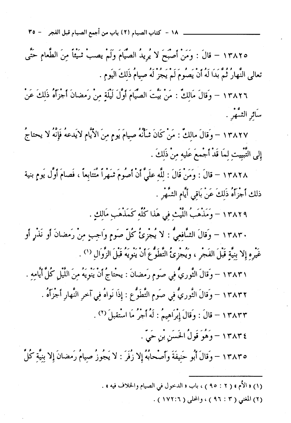 13830 - وَقَالَ الشَّافِعِيُّ: لَا يُجْزِئُ كُلُّ صَوْمٍ وَاجِبٍ مِنْ رَمَضَانَ أَوْ نَذْرٍ أَوْ غَيْرِهِ إِلَّا بِنِيَّةٍ قَبْلَ الْفَجْرِ، وَيُجْزِئُ التَّطَوُّعَ أَنْ يَنْوِيَهُ قَبْلَ الزَّوَالِ.
