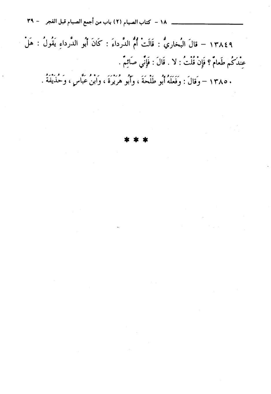 13849 - قَالَ الْبُخَارِيُّ: قَالَتْ أُمُّ الدَّرْدَاءِ: كَانَ أَبُو الدَّرْدَاءِ يَقُولُ: هَلْ عِنْدَكُمْ طَعَامٌ ؟ فَإِنْ قُلْتُ: لَا، قَالَ: فَإِنِّي صَائِمٌ.