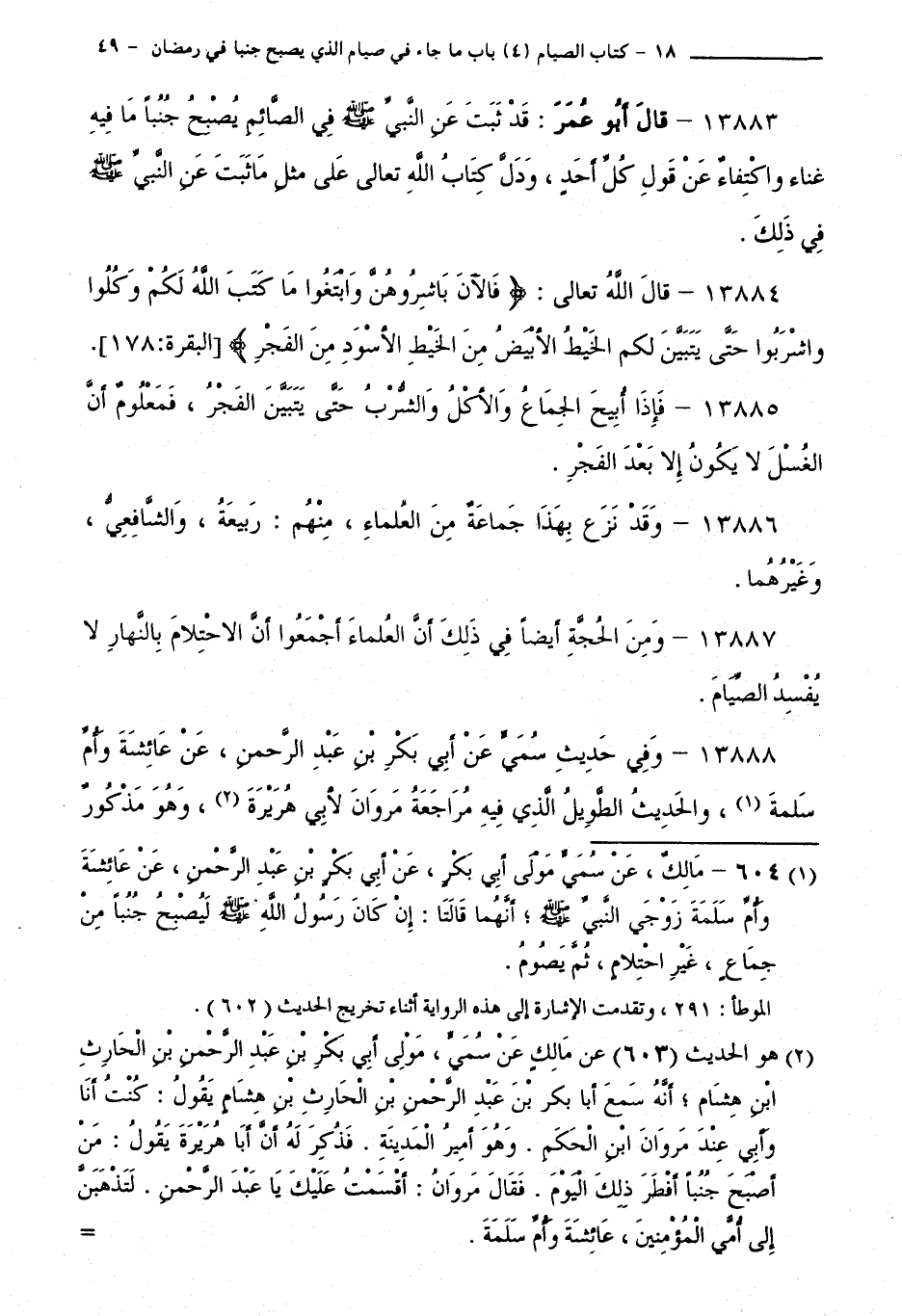 13883 - قَالَ أَبُو عُمَرَ: قَدْ ثَبَتَ عَنِ النَّبِيِّ - صَلَّى اللَّهُ عَلَيْهِ وَسَلَّمَ - فِي الصَّائِمِ يُصْبِحُ جُنُبًا مَا فِيهِ غَنَاءٌ وَاكْتِفَاءٌ عَنْ قَوْلِ كُلِّ أَحَدٍ، وَدَلَّ كِتَابُ اللَّهِ تَعَالَى عَلَى مِثْلِ مَا ثَبَتَ عَنِ النَّبِيِّ - صَلَّى اللَّهُ عَلَيْهِ وَسَلَّمَ - فِي ذَلِكَ.