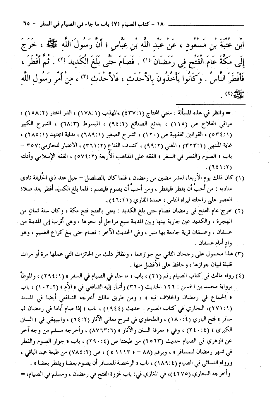 بْنِ عُتْبَةَ بْنِ مَسْعُودٍ، عَنْ عَبْدِ اللَّهِ بْنِ عَبَّاسٍ ; أَنَّ رَسُولَ اللَّهِ - صَلَّى اللَّهُ عَلَيْهِ وَسَلَّمَ - خَرَجَ إِلَى مَكَّةَ عَامَ الْفَتْحِ فِي رَمَضَانَ، فَصَامَ حَتَّى بَلَغَ الْكَدِيدَ، ثُمَّ أَفْطَرَ ; فَأَفْطَرَ النَّاسُ، وَكَانُوا يَأْخُذُونَ بِالْأَحْدَثِ، فَالْأَحْدَثِ مِنْ أَمْرِ رَسُولِ اللَّهِ - صَلَّى اللَّهُ عَلَيْهِ وَسَلَّمَ -.