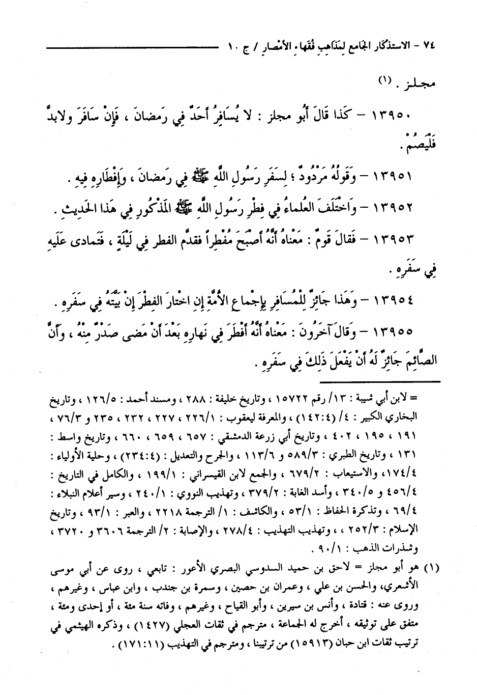 13950 - كَذَا، قَالَ أَبُو مِجْلَزٍ: لَا يُسَافِرُ أَحَدٌ فِي رَمَضَانَ، فَإِنْ سَافَرَ وَلَا بُدَّ فَلْيَصُمْ.