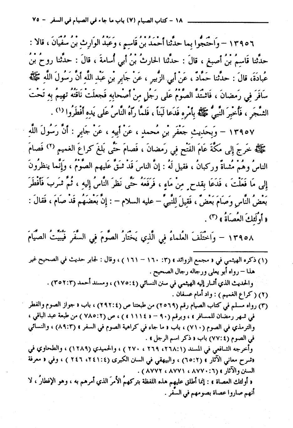 13956 - وَاحْتَجُّوا بِمَا حَدَّثَنَا أَحْمَدُ بْنُ قَاسِمٍ، وَعَبْدُ الْوَارِثِ بْنُ سُفْيَانَ، قَالَا: حَدَّثَنَا قَاسِمُ بْنُ أَصْبَغَ، قَالَ: حَدَّثَنَا الْحَارِثُ بْنُ أَبِي أُسَامَةَ، قَالَ: حَدَّثَنَا رَوْحُ بْنُ عُبَادَةَ، قَالَ: حَدَّثَنَا حَمَّادٌ، عَنْ أَبِي الزُّبَيْرِ، عَنْ جَابِرِ بْنِ عَبْدِ اللَّهِ أَنَّ رَسُولَ اللَّهِ - صَلَّى اللَّهُ عَلَيْهِ وَسَلَّمَ - سَافَرَ فِي رَمَضَانَ، فَاشْتَدَّ الصَّوْمُ عَلَى رَجُلٍ مِنْ أَصْحَابِهِ فَجَعَلَتْ نَاقَتُهُ تَهِيمُ بِهِ تَحْتَ الشَّجَرِ، فَأُخْبِرَ النَّبِيُّ - صَلَّى اللَّهُ عَلَيْهِ وَسَلَّمَ - بِأَمْرِهِ فَدَعَا لَبَنًا، فَلَمَّا رَآهُ النَّاسُ عَلَى يَدِهِ أَفْطَرُوا.