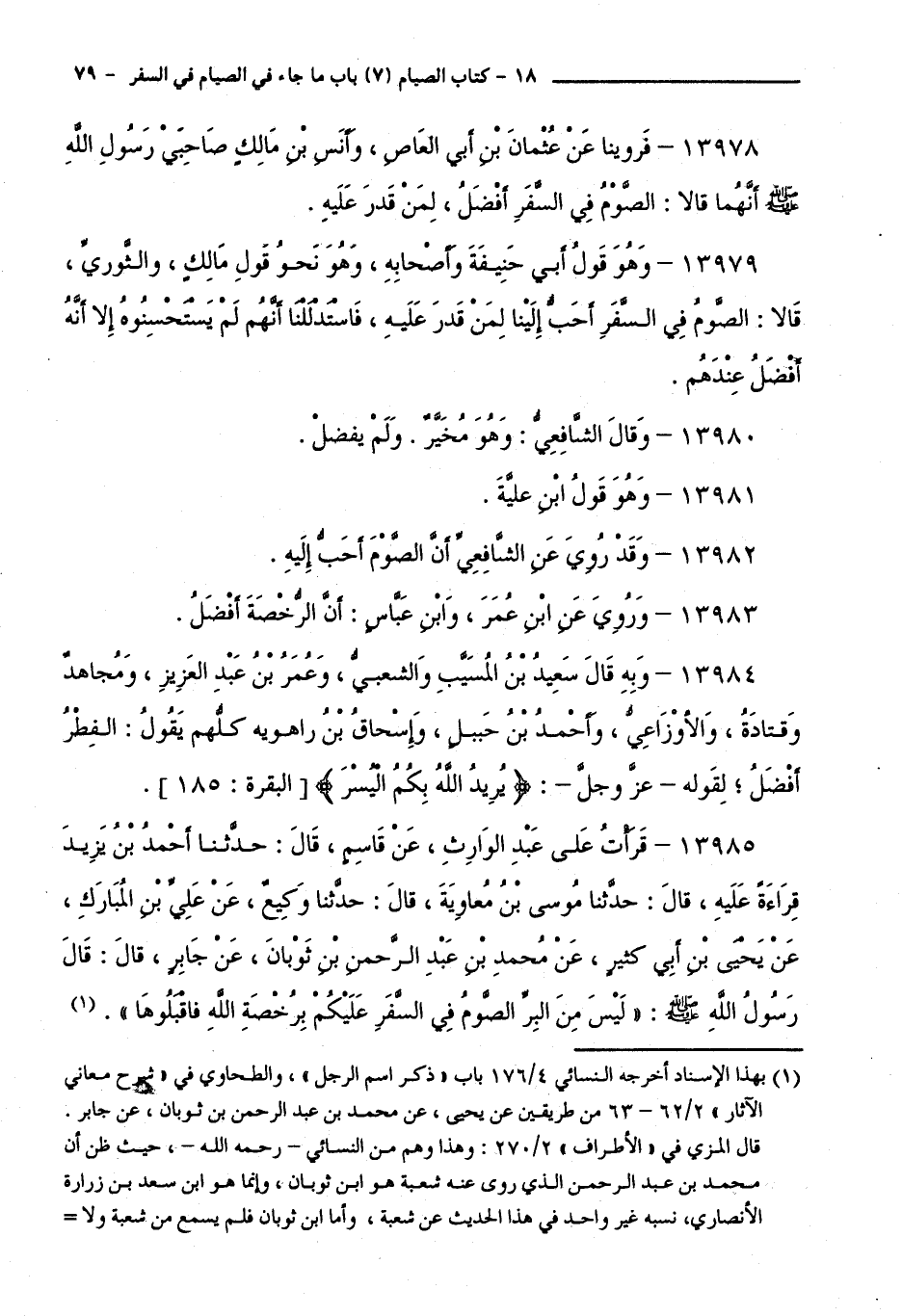 13985 - قَرَأْتُ عَلَى عَبْدِ الْوَارِثِ، عَنْ قَاسِمٍ، قَالَ: حَدَّثَنَا أَحْمَدُ بْنُ يَزِيدَ قِرَاءَةً عَلَيْهِ، قَالَ: حَدَّثَنَا مُوسَى بْنُ مُعَاوِيَةَ، قَالَ: حَدَّثَنَا وَكِيعٌ، عَنْ عَلِيِّ بْنِ الْمُبَارَكِ، عَنْ يَحْيَى بْنِ أَبِي كَثِيرٍ، عَنْ مُحَمَّدِ بْنِ عَبْدِ الرَّحْمَنِ بْنِ ثَوْبَانَ، عَنْ جَابِرٍ، قَالَ: قَالَ رَسُولُ اللَّهِ - صَلَّى اللَّهُ عَلَيْهِ وَسَلَّمَ -: " لَيْسَ مِنَ الْبِرِّ الصَّوْمُ فِي السَّفَرِ، عَلَيْكُمْ بِرُخْصَةِ اللَّهِ فَاقْبَلُوهَا ".
