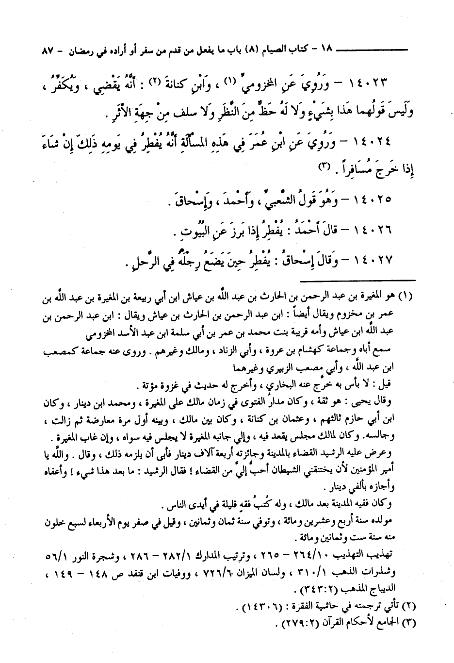 14024 - وَرُوِيَ عَنِ ابْنِ عُمَرَ فِي هَذِهِ الْمَسْأَلَةِ أَنَّهُ يُفْطِرُ فِي يَوْمِهِ ذَلِكَ إِنْ شَاءَ إِذَا خَرَجَ مُسَافِرًا.
