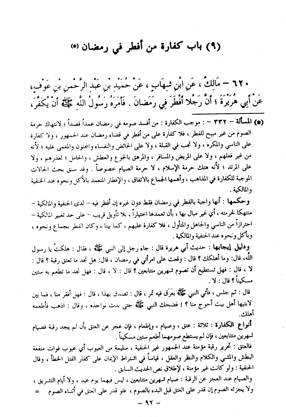 620 - مَالِكٌ، عَنِ ابْنِ شِهَابٍ، عَنْ حُمَيْدِ بْنِ عَبْدِ الرَّحْمَنِ بْنِ عَوْفٍ، عَنْ أَبِي هُرَيْرَةَ ; أَنَّ رَجُلًا أَفْطَرَ فِي رَمَضَانَ. فَأَمَرَهُ رَسُولُ اللَّهِ - صَلَّى اللَّهُ عَلَيْهِ وَسَلَّمَ - أَنْ يُكَفِّرَ،